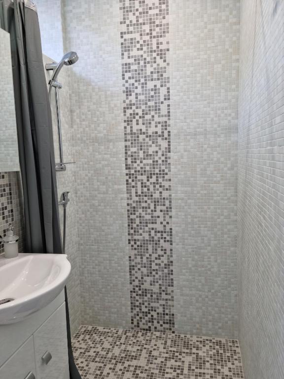 Különálló fürdőszoba, épített nagy tusolóval, kézmosó, nagy tükör, rakodóhely, hajszárító, törölköző szárító, dupla törölköző biztosítva.